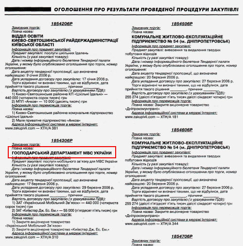 Друге. Зазвичай закупівля мобільного зв’язку для міліції відбувалася через Господарський департамент МВС, який був підпорядкований заступниці міністра Лідії Поречкіній. Про це свідчать тендери, які раніше відбувалися в Міністерстві.