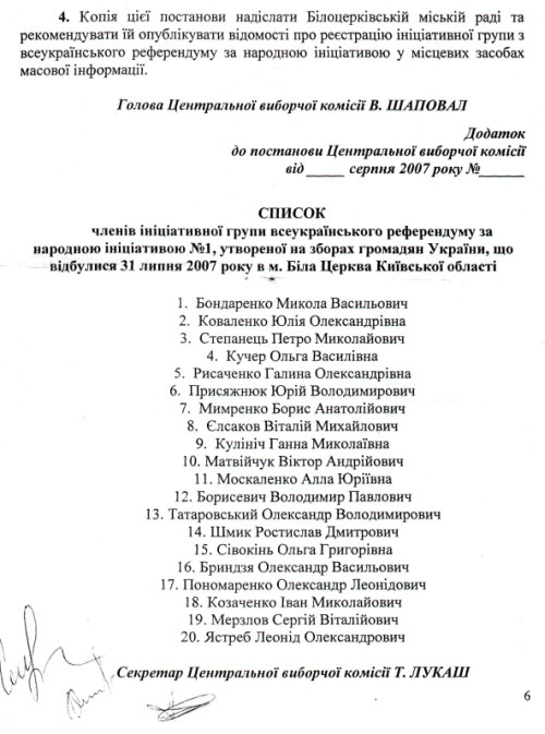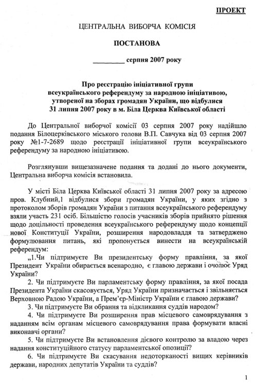 Так, в одному з пунктів проекту постанови комісії сказано: "Встановити строк збирання підписів громадян України під вимогою проведення всеукраїнського референдуму за народною ініціативою до 1 листопада 2007 року".