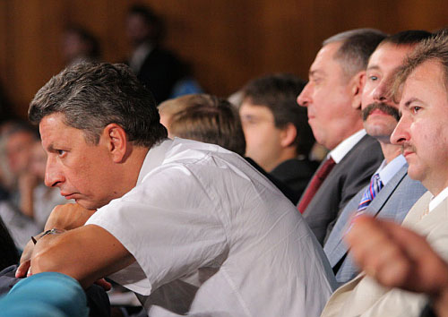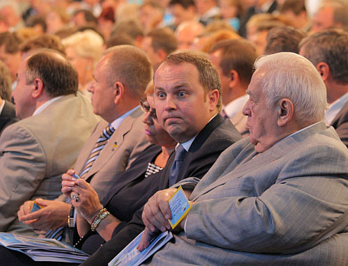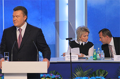 Керівники Партії регіонів красномовно розсілись у президії. Двома рівновіддаленими від Януковича полюсами стали керівник передвиборчого штабу партії Борис Колесніков, який сів праворуч, і віце-прем'єр Андрій Клюєв, що опинився зліва. Перший увесь час жартував і натхненно аплодував, другий жодного разу навіть не посміхнувся.