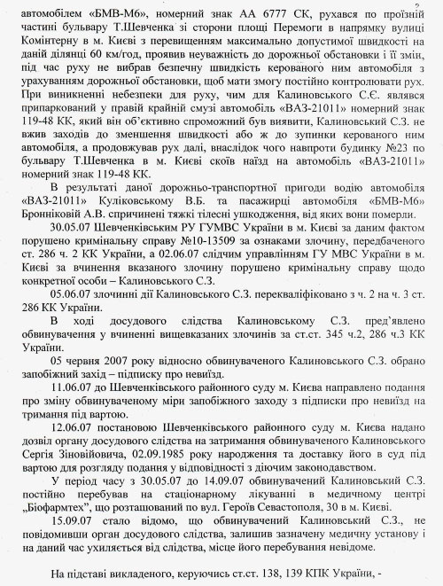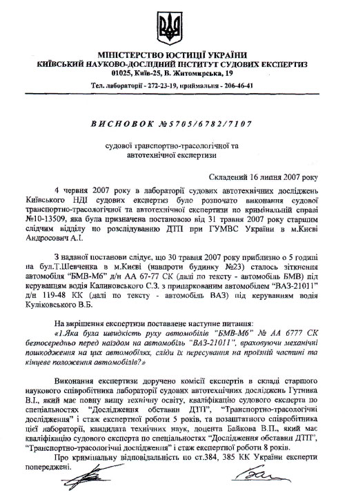 На початку серпня спеціалісти Київського науково-дослідного інституту судових експертиз Міністерства юстиції оприлюднили сенсаційний висновок. Після аналізу даних ДТП вони заявили, що автомобіль, яким керував Калиновський, рухався у майже допустимих нормах.