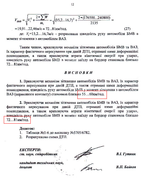 Так, згідно з даними першої експертизи, у момент наїзду на бордюр бульвару швидкість становила "близько 71...80 км/год", а в момент зіткнення з ВАЗ 21011 – "близько 55...60 км/год".