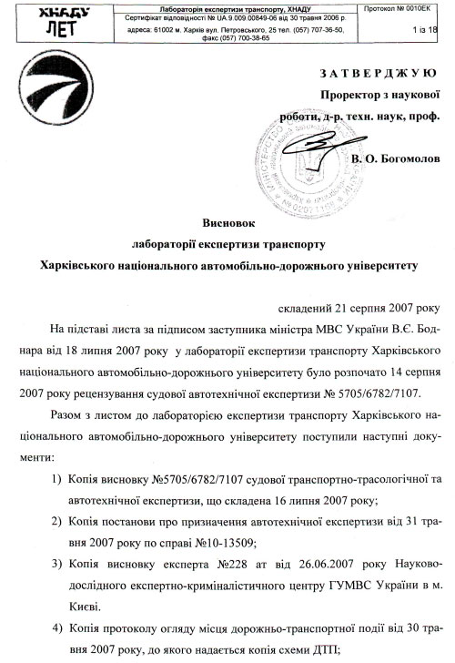 Міліція замовила нову експертизу в Харкові. Цікаво, що лист із проханням перевірити правильність дій київських спеціалістів до Лабораторії експертизи транспорту Харківського національного автомобільно-дорожнього університету направив особисто заступник міністра внутрішніх справ Віктор Боднар.
