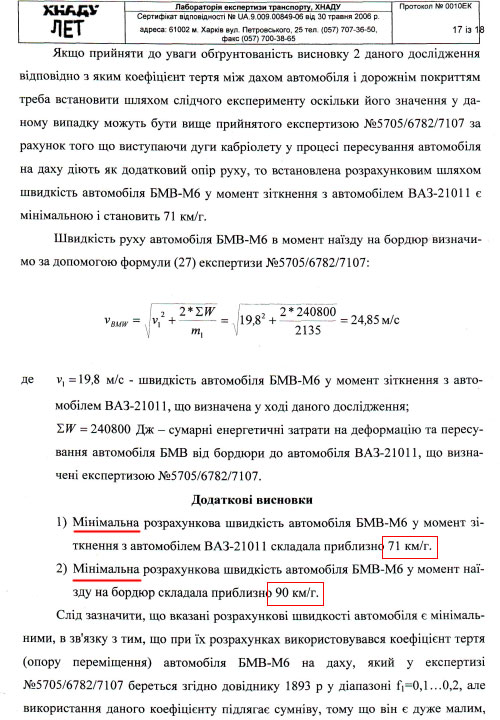 Друге – мінімальна швидкість BMW M6 в момент зіткнення з ВАЗ 21011 складала 71 км/год;