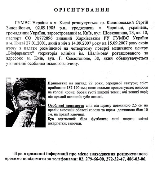 Самого Сергія Калиновського його охоронці доставили в клініку "Біофармтех", де він перебував останні три з половиною місяці.