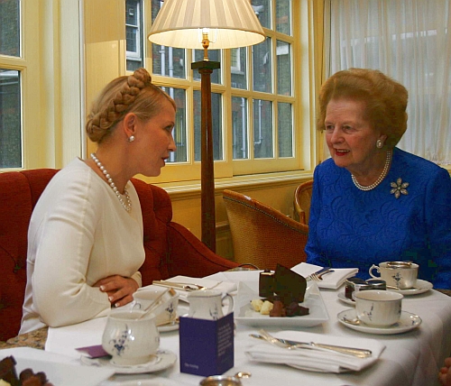 За чаєм залізні леді обговорили сучасні українські проблеми та підготовку України до виборів. Після душевної розмови Тимошенко і Тетчер вийшли під ручку, ніби добрі знайомі.