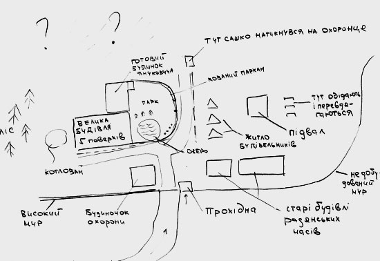 "Ми пішли назад у бік прохідної, але по дорозі звернули до красивого кованого паркану, що йшов паралельно семиметровому муру. Пройшовши зі сто метрів, вирішили, що краще обійти паркан з іншого боку, адже тоді була менша вірогідність, що нас помітить охорона. З іншого боку паркану розташовувалися надзвичайно красиві ковані ворота. За ними виднілося озеро, не надто велике, але й не маленьке. Берег озера був обкладений камінням, над поверхнею води розташувався місток. Озером плавали чорні лебеді", - захоплено переповів свої враження Сашко.