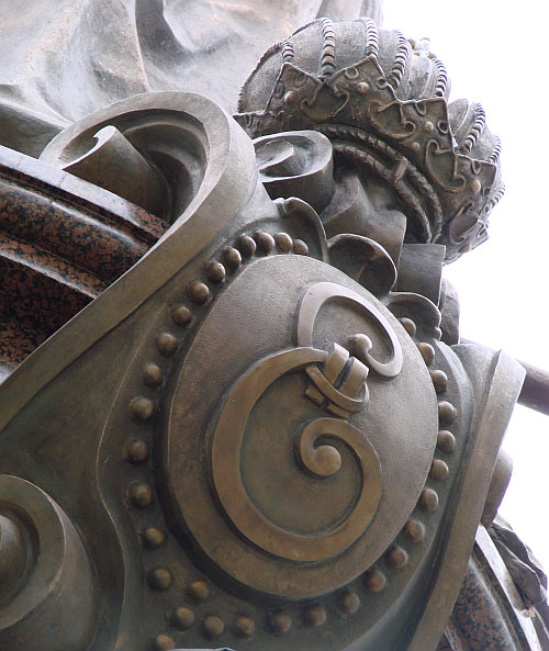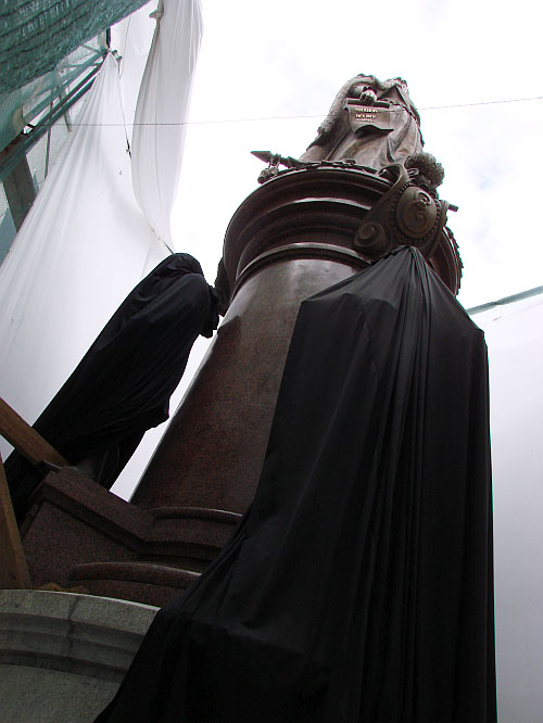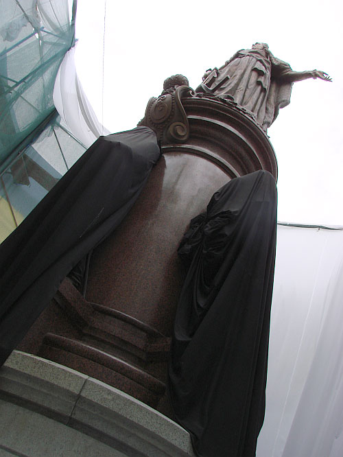 | А ось і сам монумент. Катерина - на постаменті, чорними чохлами прикриті статуї ключових діячів її епохи |