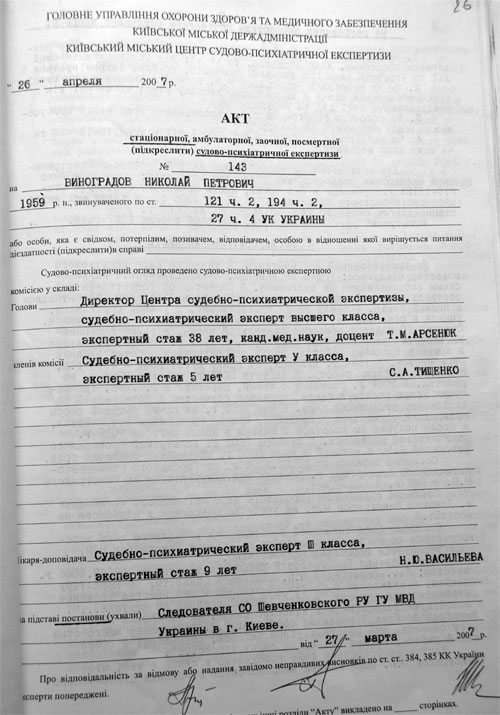 Коли Виноградов вийшов на свободу з підпискою про невиїзд на руках, він ліг до психічної лікарні в селищі Глеваха.