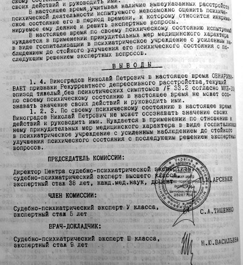 Проведена у лікарні Павлова експертиза також не дала висновків на ключові питання, які ставили перед нею: "Чи перебував Виноградов у період вчинення ним суспільно-небезпечних діянь в тимчасовому хворобливому стані та чи міг він усвідомлювати свої дії та керувати ними при вчиненні злочинів, що йому інкримінуються?"
