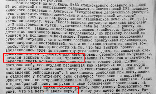 У березні 2007 року Виноградова було направлено на судово-психіатричну експертизу, а за кілька місяців до того він начебто здійснив спробу самогубства – стверджують, що він намагався порізати собі вени.