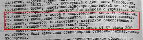 "Испытуемый поступил на стационарное лечение по направлению психиатра Киево-Святошинской ЦРБ 17 октября 2006 года. В графе анамнез заболевания указано: "Два года назад перенес затяжную стрессовую ситуацию, продлившуюся полтора года, в результате чего лишился работы, развелся с женой. Осенью 2005 почувствовал, что необходима помощь психиатра: снизилось настроение, появилась плаксивость, не спал неделями, похудел на 20 кг..."