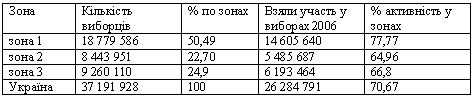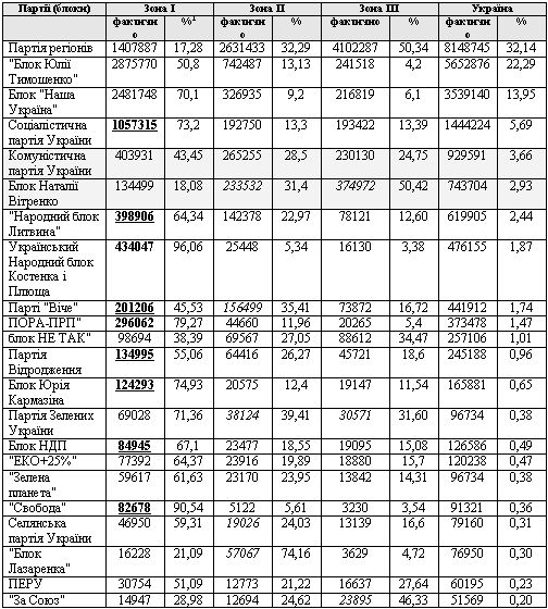 Узагальнені результати голосування за партії по зонам у 2006 році приведені у таблиці 3.