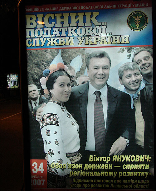 Усі центральні вулиці Києва були прикрашені його зображенням. Виглядало це як реклама "Вісника податкової служби", і таким чином Янукович обійшов закон.