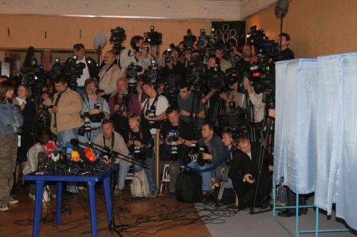У той час, коли оточення Януковича дихало свіжим повітрям, всередині виборчої дільниці, як кілька в томатному соусі, трамбувалася преса. Тут вже за півтори години до появи прем'єра ніде було яблуку впасти – оператори і фоторепортери вишикувалися в три яруси, щоб відзняти голосування другої особи в державі.