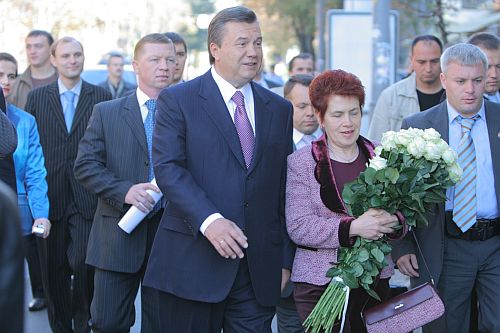 Кортеж Януковича заїхав за ріг будинку. Було видно, що йому спекотно – він вийшов із машини в білій сорочці, але охоронець протягнув йому піджак. За секунду вийшла дружина Януковича Людмила.