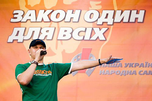 Його риторика була такою самою і в Білій Церкві, куди він приїхав на мітинг. Незважаючи на сильний дощ, там зібралось близько 5 тисяч осіб з помаранчевими та бордовими прапорами.