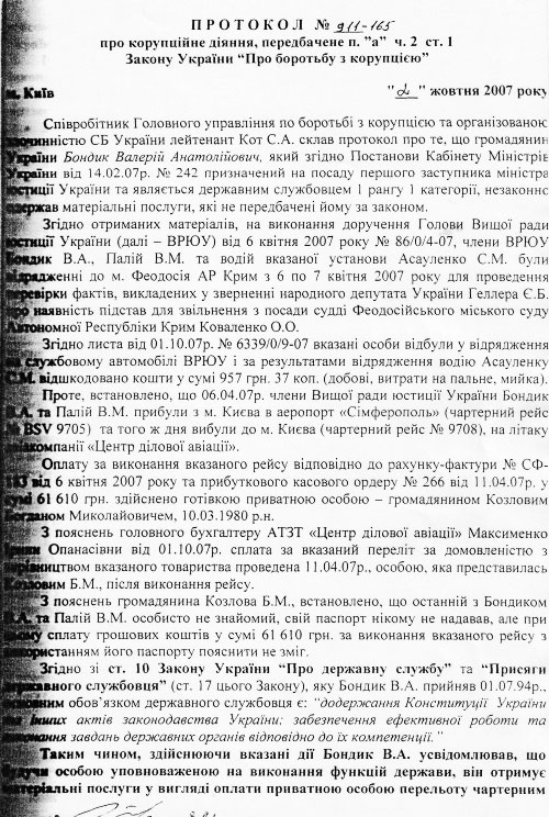За фактом винесення у Феодосії неправомірної ухвали була порушена кримінальна справа кримською прокуратурою. Але сам протокол про корупцію стосується іншого – там ідеться про те, як Бондик дістався до Криму.
