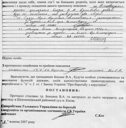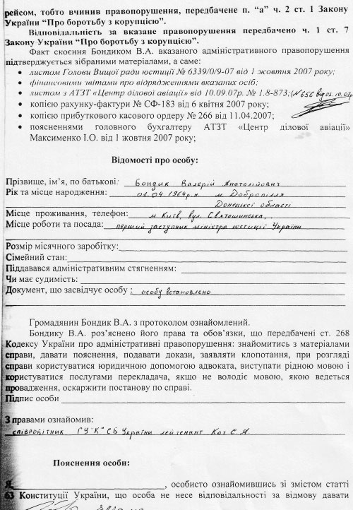 У підсумку, в протоколі про корупцію СБУ записало: "Бондик усвідомлював, що, будучи особою, уповноваженою на виконання функцій держави, отримав матеріальні послуги у вигляді оплати приватною особою перельоту чартерним рейсом".