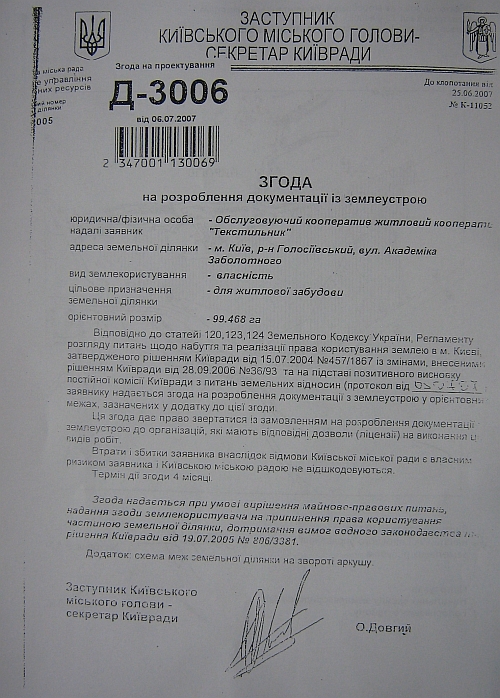 Усі 7 дозволів на розробку документації із землевпорядження, підписані Довгим, датовані 6 липня, і в тексті кожного документа є посилання на позитивний висновок комісії з питань земельних відносин, також датоване одним числом – 5 липня.