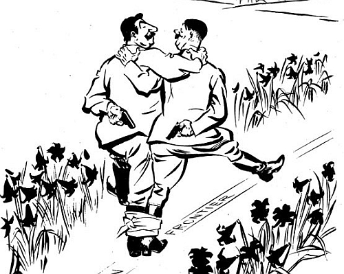 Вони прогулюються, обнявшись, і ведуть дружелюбну бесіду. Здається, повна ідилія! Але за спинами заховані пістолети, і партнери готові в будь-який момент спустити курок... Гітлер і Сталін – карикатура, опублікована в англійській газеті "Evening Standard" у листопаді 1939-го.