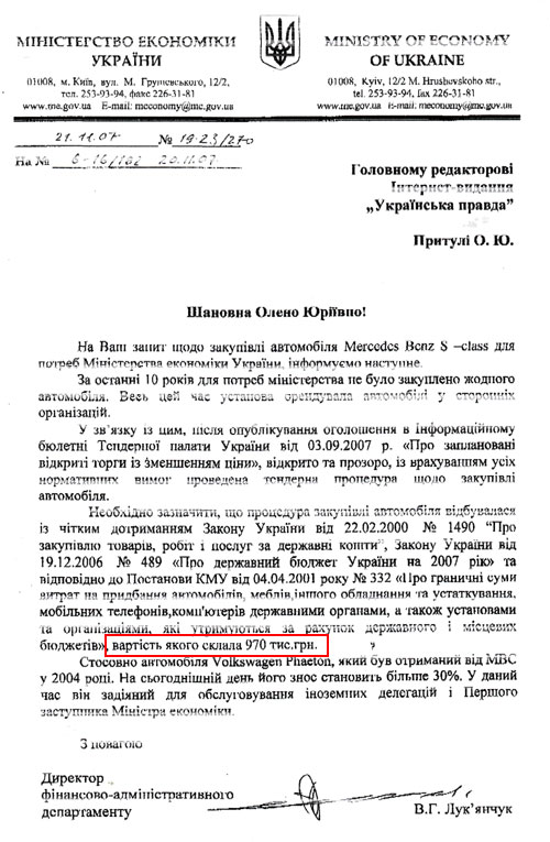 Коли кореспондент "Української правди" зателефонував до автосалону, де придбали цю машину, там з ходу запропонували: "За 170 тисяч доларів ми підберемо вам "Мерседес" S-класу в дуже добрій комплектації".