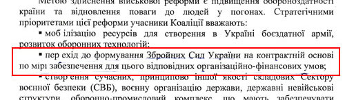 У остаточному варіанті, який тепер скріплюють підписами, зазначено, що перехід до формування збройних сил України на контрактній основі відбуватиметься "по мірі забезпечення для цього відповідних організаційно–фінансових умов".