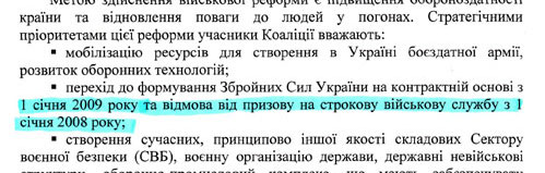 Тоді як у версії документу, яка так дратувала Ющенка, було записано дуже конкретну обіцянку, що відповідала передвиборчим заявам Тимошенко: "перехід до формування збройних сил України на контрактній основі з 1 січня 2009 року та відмова від призову на строкову службу з 1 січня 2008".