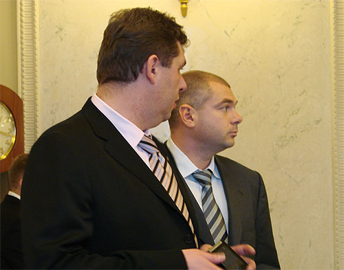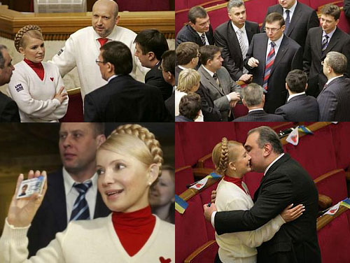 Депутати тим часом скупчилися біля підписних столів, де скріплювали автографами текст присяги – саме з цього моменту починалися їхні повноваження. Лідер комуністів Петро Симоненко виявився у оточенні депутатів від блоку Тимошенко. Судячи з його невдалих спроб пожартувати, почувався він дуже некомфортно.