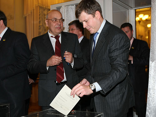 Голосування за Яценюка почалося відповідно до схеми, окресленої Тимошенко зранку – вона разом з Турчиновим стали біля урн, а коаліціанти один за одним заходили в кабінки, відмічали свій вибір, дисципліновано підходили до урн і, демонстративно показавши Турчинову і Тимошенко бюлетені, вкидали їх у прозору скриньку. "Зброєносець" лідерки БЮТ робив відповідні помітки в списку.