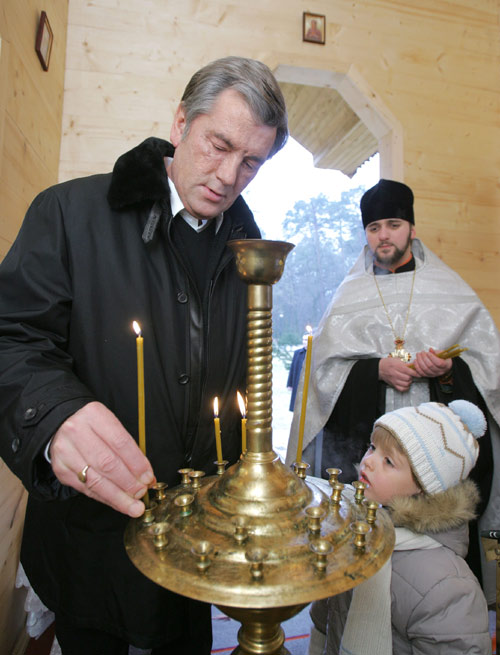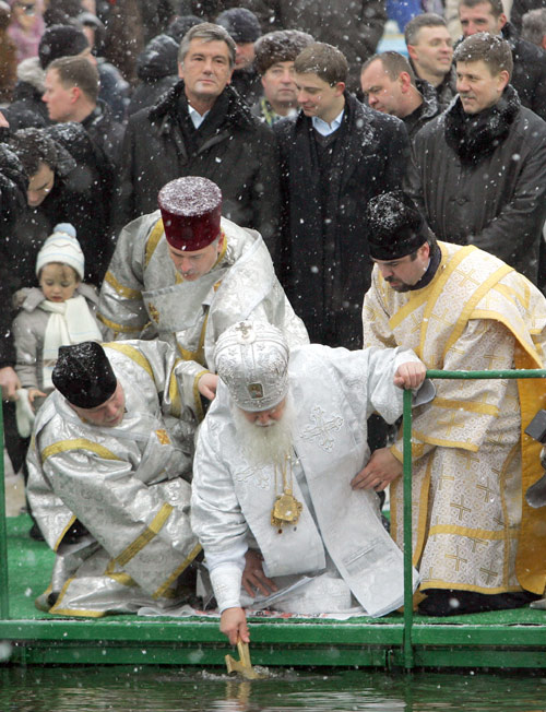 Він був присутній на священному молебні, який провів глава УПЦ Київського патріархату Філарет. Після цього патріарх також здійснив чин освячення дніпрових вод та води в каплиці Хрещення Господнього.