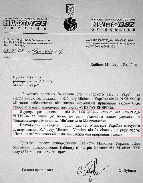 28 січня голова НАК "Нафтогазу України" Олег Дубина звернувся до Кабінету міністрів з проханням припинити дію розпорядження уряду Юрія Єханурова про створення закритого акціонерного товариства "УкрГаз-Енерго".