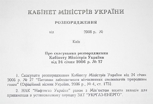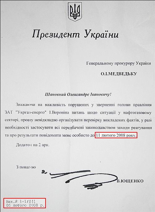 "Зважаючи на важливість порушених у зверненні голови правління ЗАТ УкрГаз-Енерго І. Вороніна щодо ситуації у нафтогазовому секторі, прошу невідкладно організувати перевірку викладених фактів, у разі необхідності застосувати всі передбачені законодавством заходи реагування та про результати повідомити мене особисто до 11 лютого 2008 року".