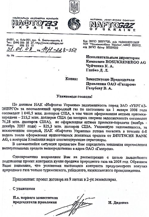 31 січня, через три доби після ухвалення рішення про ліквідацію УкрГаз-Енерго, перший заступник голови НАКу Ігор Діденко написав своєму колезі у Газпромі, Валерію Голубєву, офіційного листа.