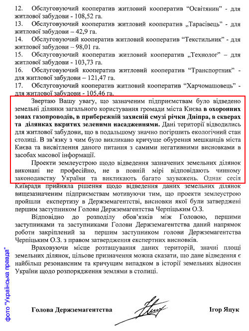 "Звертаю вашу увагу, що зазначеним підприємства було відведено земельні ділянки загального користування громади міста Києва в охоронних зонах газопроводів, в прибережній захисній смузі Дніпра, в скверах та ділянках, вкритих зеленими насадженнями. Дані території відводилися для житлової забудови, що в подальшому значно погіршить екологічний стан столиці. Проекти землеустрою виконані непрофесійно, не в повній мірі відповідають законодавству України та викликають багато зауважень", - сказано в листі.
