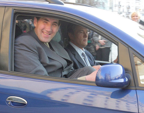 | Ющенко покатав Стадніка у себе на подвір'ї перед секретаріатом |