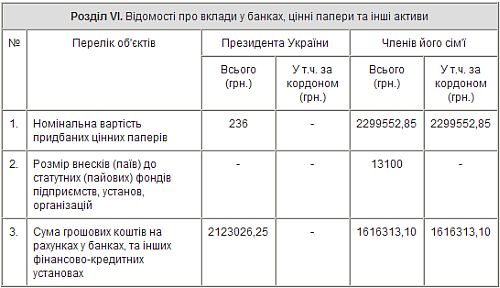 Крім того, дружина президента володіє цінними паперами за кордоном, номінальна вартість яких складає більше 2 мільйонів гривень. Там же, за кордоном, лежать її заощадження, які нині еквівалентні 1,6 мільйонів гривень.