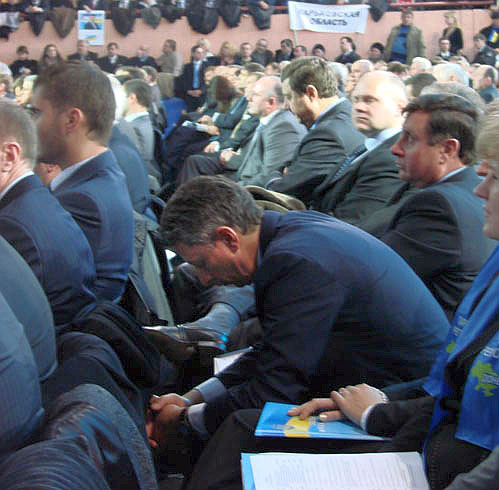 – Надо же какой!.. – іронічно посміхнулась під час виступу Тихонова жінка, що сиділа в першому рядку у секторі делегатів Луганської області. – А что же это вы на выборы под указку Юща-то пошли?! А ведь когда-то он прямо с той сцены кричал, что не собирается ползать на коленях перед Ющенко?