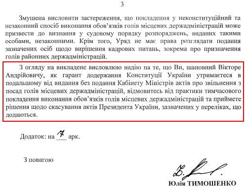 "З огляду на викладене, висловлюю надію на те, що ви, шановний Вікторе Андрійовичу, як гарант додержання Конституції, утримаєтеся в подальшому від видання без подання Кабінету міністрів актів про звільнення з посад голів місцевих адміністрацій, відмовитеся від практики тимчасового покладення виконання обов’язків голів місцевих адміністрацій та приймете рішення про скасування актів президента України, зазначених у переліках, що додаються".