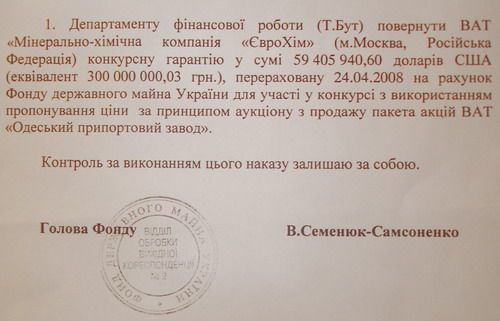 Однак гроші "ЄвроХіму" були повернуті дорученням Валентини Семенюк, а представники компанії до останнього заперечували свою участь у конкурсі. З боку росіян до минулої п’ятниці було заявлено ВАТ "Акрон".