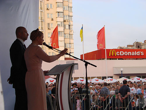 На Оболоні сцену для Тимошенко встановили біля "Макдональдсу". В очікуванні головних гостей мешканців району розважає народний артист України Тарас Петриненко, який подорожує в трупі з Тимошенко від виборів до виборів.