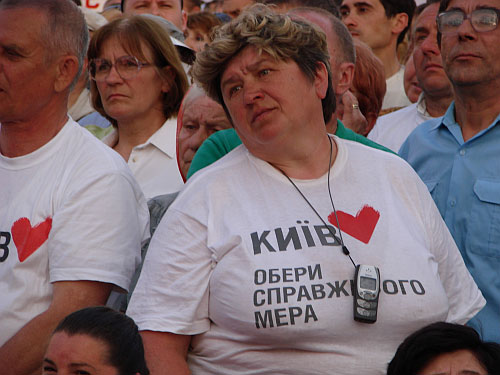 Чи то політична свідомість на Оболоні дуже розвинута, чи то штаб БЮТ добре підготувався, але в натовпі знайшлися люди, які знали, що кричати Тимошенко у відповідь.