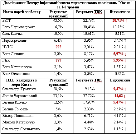 Проте, очевидно, що всі головні вороги цього замовника на київському рівні отримали по заслугам – рейтинг блоку Черновецького схуд майже на 14%, ГАКу ж потрапити до результатів опитування взагалі не пощастило. Що ж до Литвина, то може Україні він і потрібен, проте Києву, за версією оазівців, точно ні.