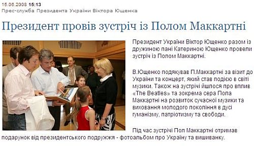 | Прес-служба президента не згадала, що Ющенко обдарував Маккартні у Пінчука |