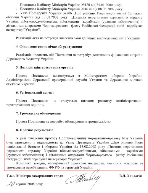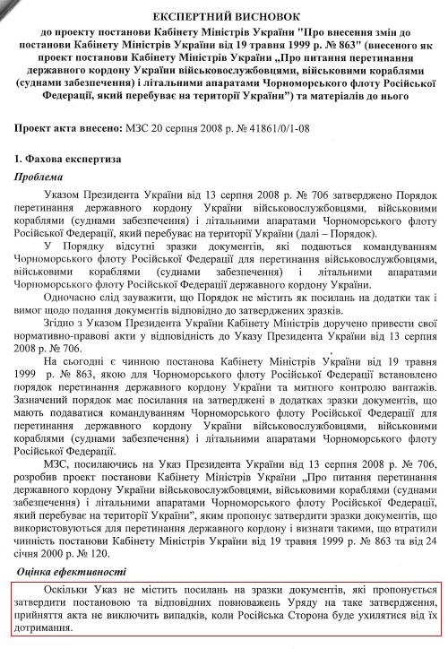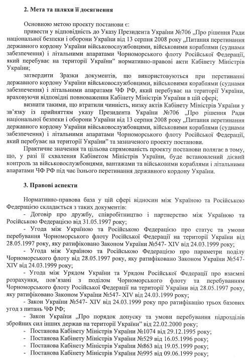 "Прийняття акта не вирішить проблем, пов’язаних із зобов’язанням командування ЧФ РФ подавати документи за зразком, а також не буде сприяти дієвому контролю за військовослужбовцями, вантажами та військовими кораблями та літальними апаратами Чорноморського флоту Російської Федерації під час їхнього перетинання державного кордону України", - також стверджує заступник міністра Кабміну.