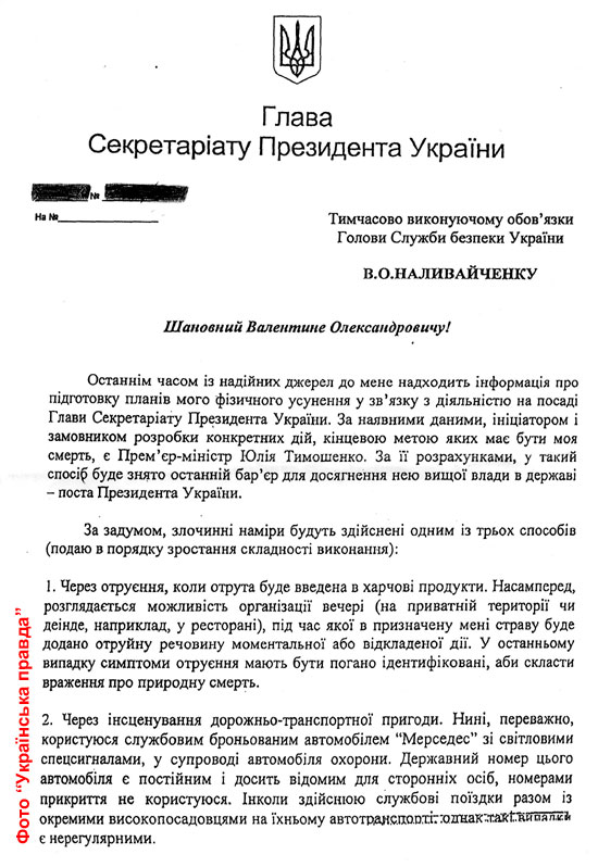 Шеф Банковой, помимо самого факта поступающих к нему угроз, указывает в письме на Тимошенко как на инициатора и заказчика своего убийства, а также описывает возможные сценарии покушения.