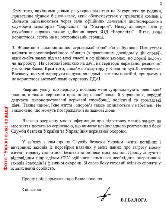 В распоряжении "Украинской правды" оказалось письмо главы секретариата президента на имя исполняющего обязанности СБУ Валентина Наливайченко. Именно это обращение имела в виде пресс-секретарь спецслужбы Марина Остапенко, когда в прошлую среду объявила о проверки информации о возможном покушении на Балогу.