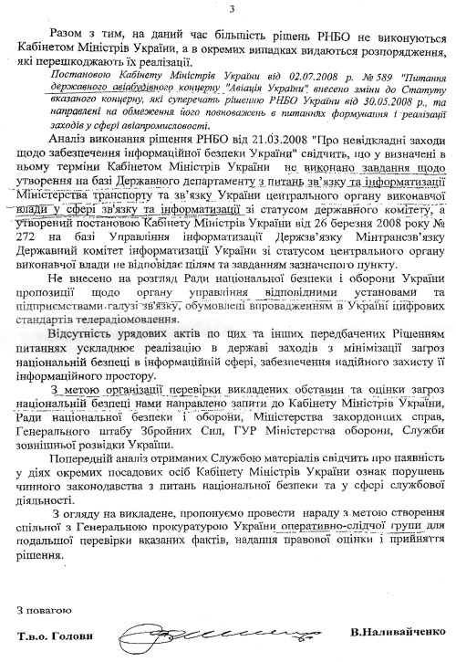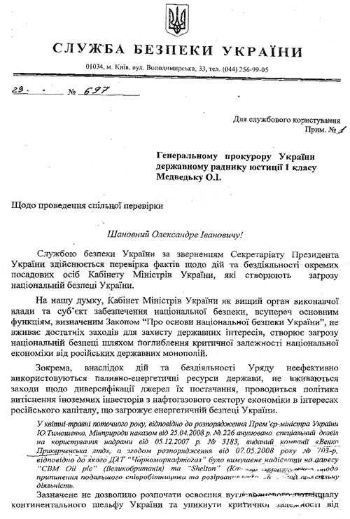 "Аналіз наявної в СБУ інформації свідчить про переважання в діяльності Кабінету міністрів корпоративних інтересів над загальнонаціональними, що може призвести до встановлення контролю з боку Росії над стратегічно-важливими для економіки держави підприємствами", - ідеться також в листі.