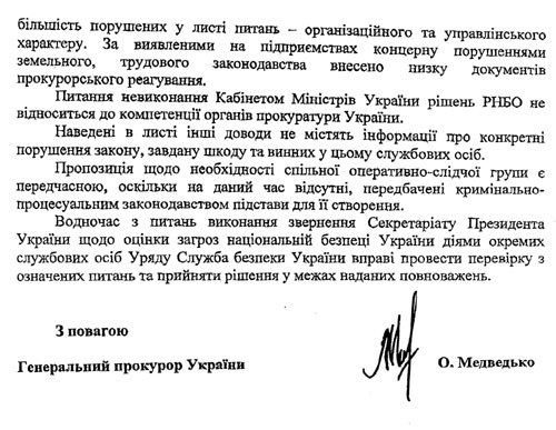"Питання невиконання Кабінетом міністрів рішень РНБО не відноситься до компетенції органів прокуратури України, - також заявив Медведько. - Наведені в листі інші доводи не містять інформації про конкретні порушення закону, завдану шкоду та винних у цьому службових осіб".
