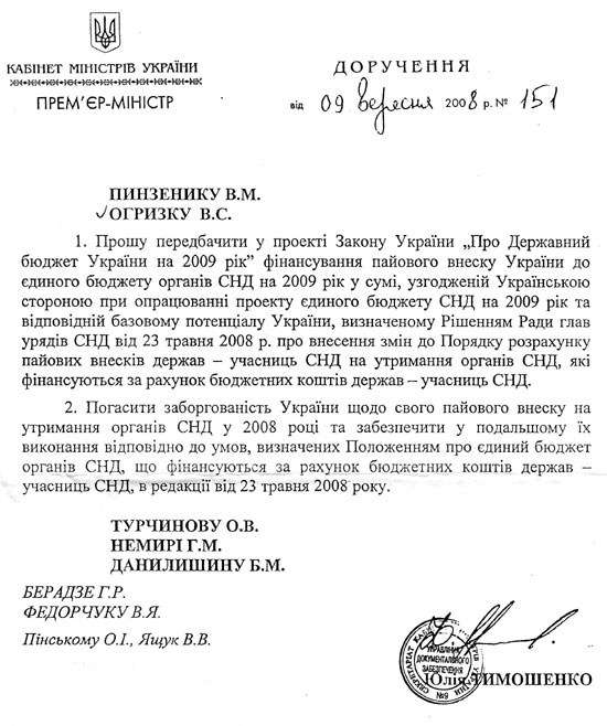 У розпорядженні "Української правди" є доручення прем’єра, адресоване міністрам фінансів та закордонних справ. Тимошенко звернулася до Пинзеника та Огризка з вимогою "погасити заборгованість щодо пайового внеску України на утримання органів СНД у 2008 році".