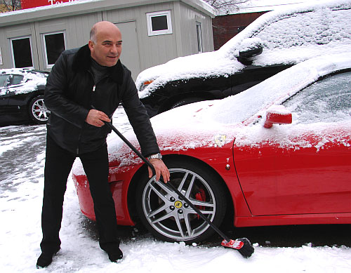 | Цинцабадзе чистит от снега "Феррари" на стоянке своего автосалона |